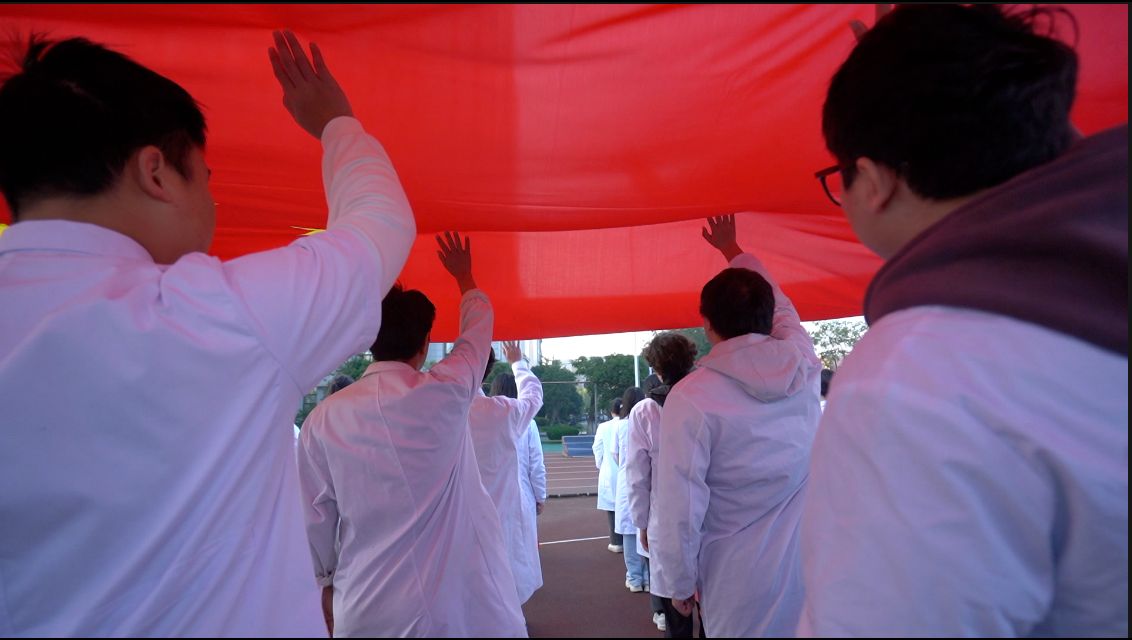 升旗仪式结束后,芜湖蓝天救援队6名队员手持2020年8月1日在天安门广场使用的国旗,全体师生面向国旗,共同宣誓:“爱党爱国爱人民,祖国在我心中,国旗在我心中,请党放心强国有我,请党放心强国有我。”