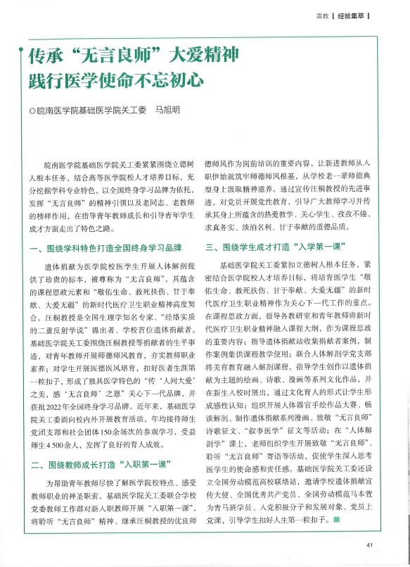 近年来,公司关工委在校关工委的指导下,紧紧围绕立德树人根本任务,聚焦医学人才培养目标,凝练专业特色,打造了以“传‘人间大爱’之美,感‘无言良师’之恩”为主题的关心下一代工作品牌,并于2022年成功获批“全国终身学习品牌”项目。该品牌以遗体捐献者——“无言良师”的感人事迹为核心,融通课程思政与医疗卫生职业精神教育,年均开展教育活动150余场,覆盖校内外师生4500余人,育人效果显著。