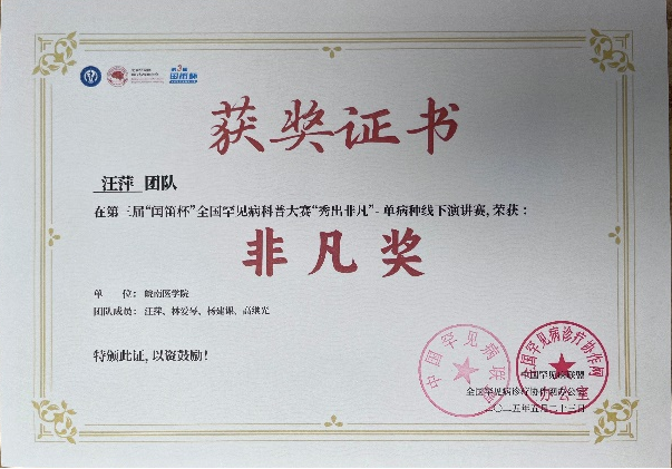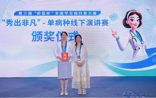 近日,2025年罕见病国际交流会(IRDCC)在海南省海口市举行,医员工物学教研室汪萍、林爱琴两位老师参会,并荣获第三届“闰笛杯”全国罕见病科普大赛“秀出非凡”单病种线下演讲赛最高奖“非凡奖”。
