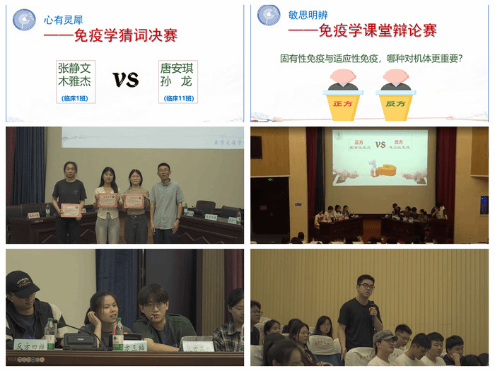 此次系列活动在学期初进行了布置安排,由授课教师组织员工自愿报名、自由组合。结课时,举行现场总结会暨免疫学课堂辩论赛,表现优秀的同学获得“免疫学之星”称号。6月7日晚,总结会在逸夫科技楼一楼报告厅如期举行。在课程团队刘辉、厉荣玉老师指导下,来自2022级临床医学和医学影像学专业的近百名员工到场参加。开场,以免疫学猜词决赛作为热身,初赛中脱颖而出的临床1班和临床11班的两个优秀组合进行角逐。紧张的五分钟内,每个组合使出浑身解数,通俗、幽默的描述让一个个晦涩的免疫学名词生动起来,猜词人也心领神会并准确猜出,现场激起阵阵掌声,最终张静文和木雅杰两位同学赢得最佳猜词组合。