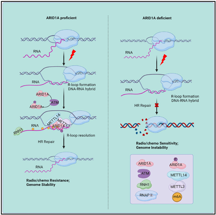 本研究首先证实了RNase H1更倾向结合带有m6A甲基化修饰的R-Loop,并推动R-Loop的分解以促进DSB的DNA末端切除,从而确保基因组的稳定性。机制上,该团队鉴定出ARID1A在响应DNA损伤应激时快速识别R-Loop并进一步招募RNA甲基转移酶METTL3/14,从而驱动R-Loop RNA发生m6A修饰。功能研究显示ARID1A及METTL3的缺失会导致R-Loop积累,同时ARID1A-METTL3信号轴缺陷的细胞对基因毒性疗法更加敏感。鉴于异常表达的ARID1A与肿瘤患者对基因毒性疗法的耐药性有关,这些发现为探索针对ARID1A异常表达癌症的治疗提供了潜在新策略。