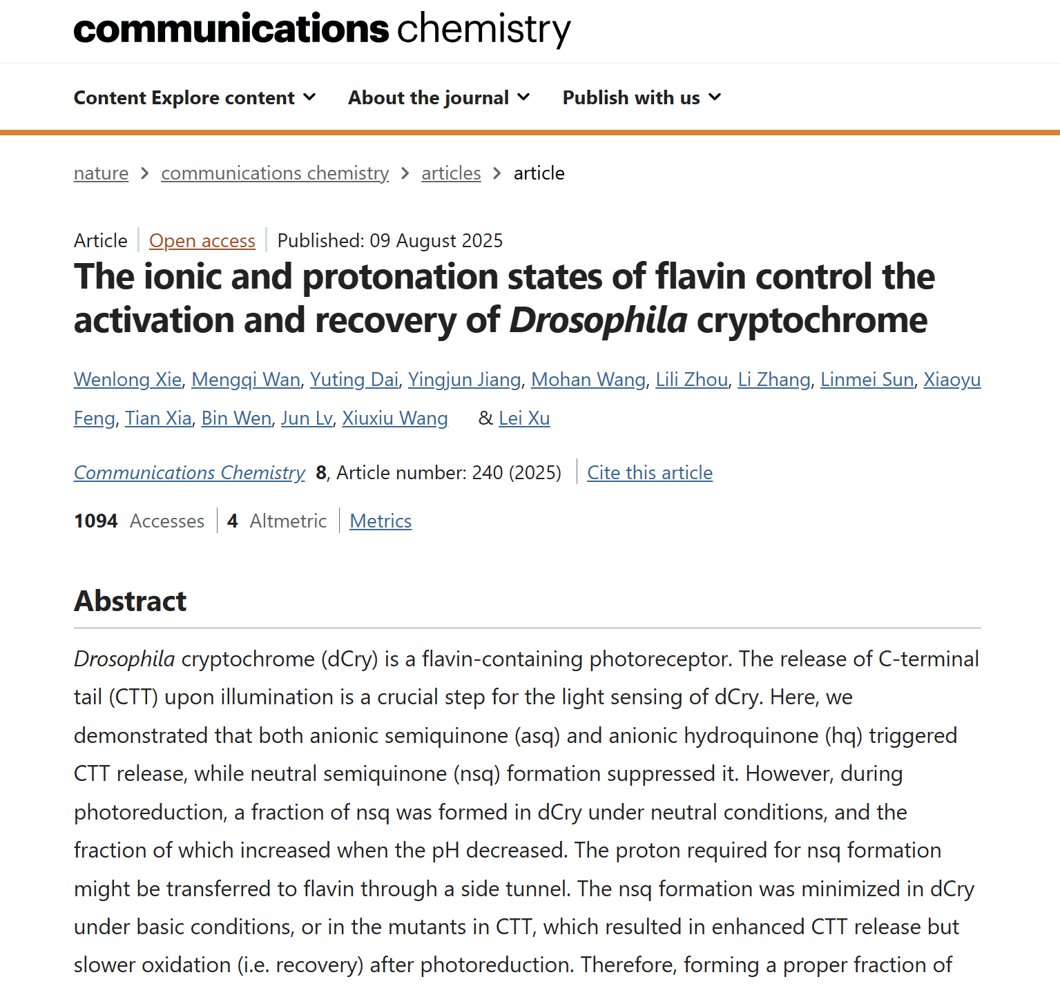 近日,生化教研室徐蕾教授团队在Nature子刊Communications Chemistry(IF = 6.2,中科院一区Top期刊)发表题为《The ionic and protonation states of flavin control the activation and recovery of Drosophila cryptochrome》的研究论文,阐释了果蝇生物钟蛋白隐色素的作用机制。公司2025届生物化学与分子生物学专业研究生谢文龙、2024届药物制剂专业本科生万梦琪(现为2025级药理学专业研究生)为共同第一作者,人体解剖学教研室王秀秀、生化教研室徐蕾教授为通讯作者。