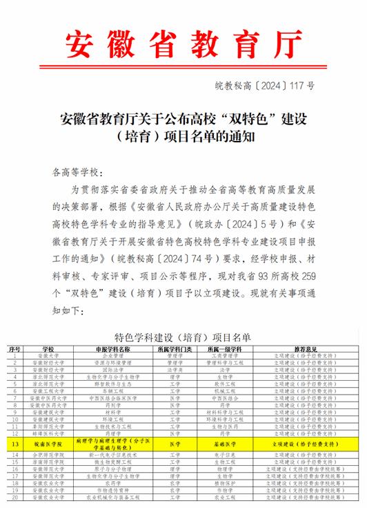 日前,《安徽省教育厅关于公布高校“双特色”建设(培育)项目名单的通知》、《安徽省教育厅关于2023年度高峰学科和高峰培育学科绩效评价结果的通报》公布,公司病理学与病理生理学(分子医学基础与转化)获批省级特色团队建设项目,基础医学高峰培育学科在2023年度省级高峰培育学科绩效评估中获得优秀等次。