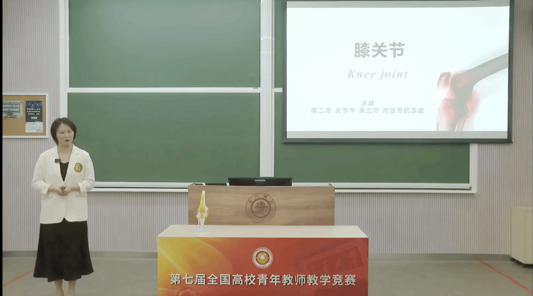 本届大赛设置文科、理科、工科、医科、思想政治课专项5个组别,竞赛内容由教学设计、课堂教学、教学反思三部分组成,决赛选手均为近3学年持续从事一线教学工作的高校青年教师。赛前每位参赛教师需提交一门课程16个学时的教学设计和教学课件,比赛前1小时现场随机抽取其中1个学时进行课堂教学展示和反思,最终综合三部分成绩得出总分。决赛现场,产翠翠老师参赛课程为《系统解剖学》,随机抽取的题目是“膝关节”。短短20分钟的现场授课,展示了安徽医公司校青年教师的智慧才华与青春风采,获得评委以及线上观摩直播网友的一致好评。