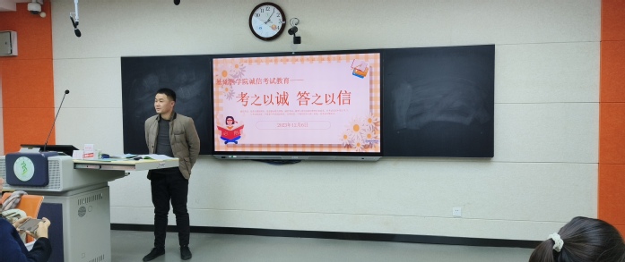 为提高员工诚信考试意识,做好英语四级和期末考试动员,12月6日晚,tyc5997太阳集团在一号教学楼1206教室举行“考之以诚 答之以信”诚信考试主题班会,班会由员工辅导员卞显洋主持。