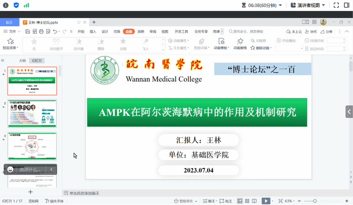 王林博士围绕腺苷酸活化蛋白激酶(AMPK)在阿尔茨海默病(AD)发病中的作用及其内在机制进行深入研究。Ⅱ型糖尿病(T2DM)患者的AD发病率明显高于非T2DM人群,T2DM是导致AD发病率上升的重要原因之一。研究认为,AMPK是关键的能量传感器,在T2DM发生过程中出现功能异常,通过激活AMPK可以明显减轻AD相关病理变化,并改善认知功能。该研究成果为AD的早期预防和治疗提供了新的策略。本次讲座内容丰富,语言生动,给与会人员留下深刻印象。