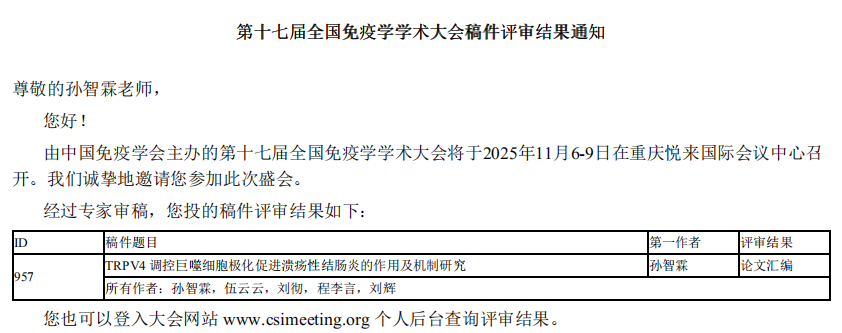 通过与各界专家的深入探讨,参会师生更加全面地了解研究领域最新前沿动态,拓宽了学术视野,获得了科学研究的新启发。尤其在溃疡性结肠炎、银屑病机制等方面受到启发,为后续课题设计与实验开展积累了重要参考。此外,公司本科生孙智霖撰写的“TRPV4调控巨噬细胞极化促进溃疡性结肠炎的作用及机制研究”被会议论文集收录,体现出公司在员工科研创新能力培养方面的成果。未来,公司将继续鼓励师生参与高水平学术会议,拓展合作网络,逐步提升团队建设水平和科研实力,推动医学教育高质量发展。(伍云云/文、供图)